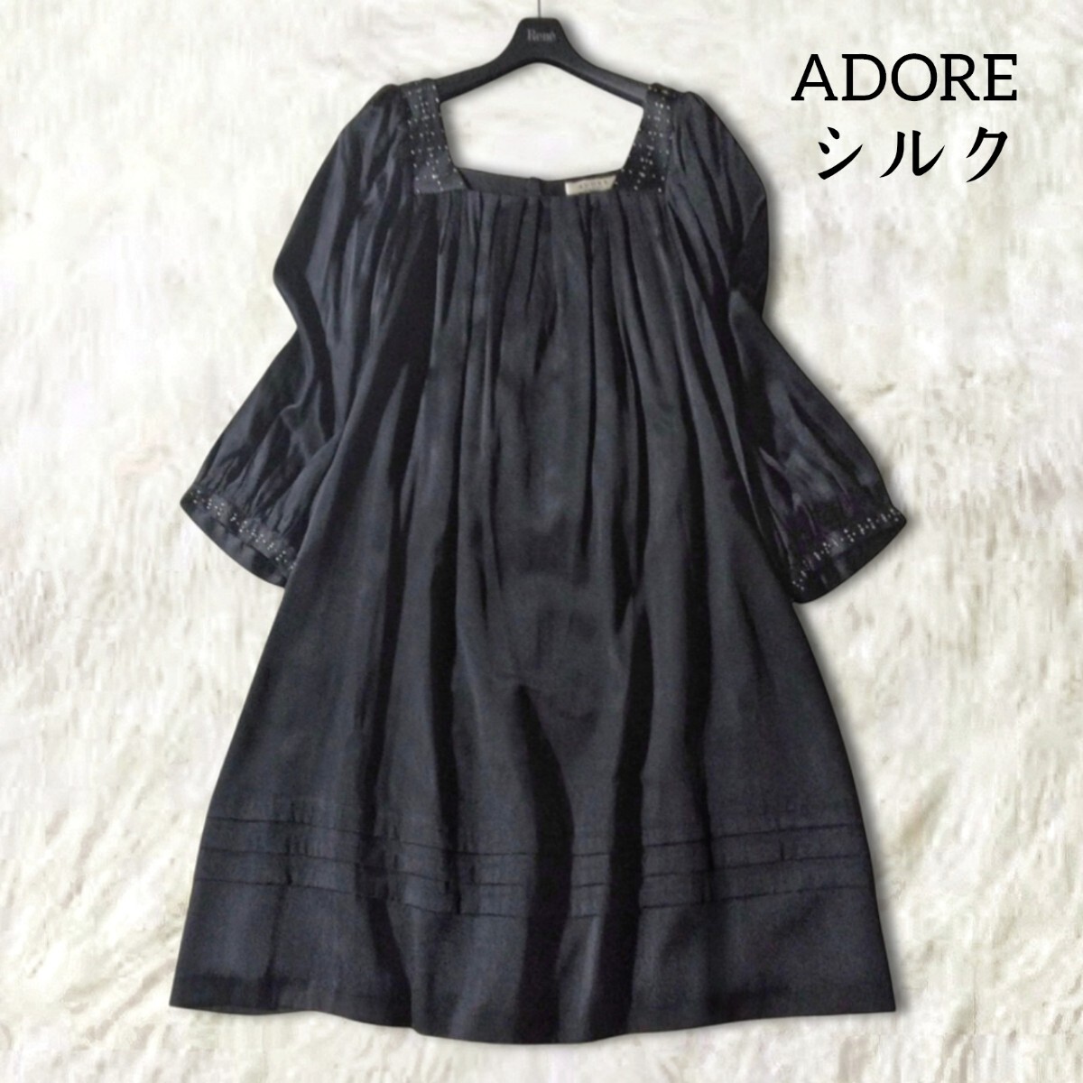 > 58 【ADORE】 アドーア シルク混 ビジュー ワンピース 38 M 黒 ブラック 無地 シンプル 薄手 ひざ丈 膝丈 ビーズ フォーマル タック