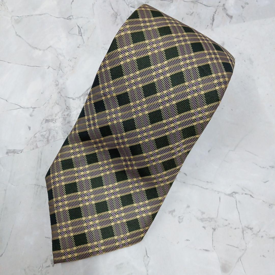 - フェアファクス ネクタイ 緑 薄い黄色 チェック柄 絹【n861】