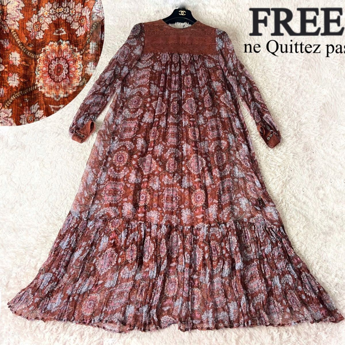 > ne Quittez pas ヌキテバ ヌキテパ ロングワンピース マキシ フレア Aライン 総柄 刺繍 シースルー プリーツ 赤 レッド ペイズリー フリー