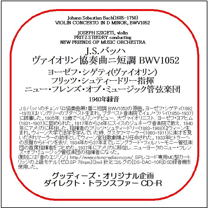- J.S.バッハ:ヴァイオリン協奏曲ニ短調/ヨーゼフ・シゲティ/送料無料/ダイレクト・トランスファー CD-R