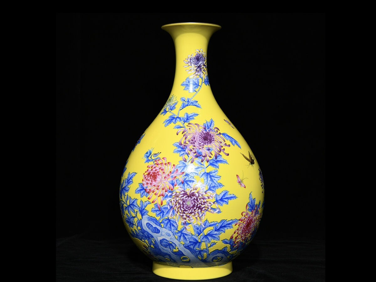 - 「清 雍正年製 陶磁器 黄地粉彩花蝶紋 玉壺春瓶」染付 置物 擺件 古賞物 中国古美術 旧蔵出