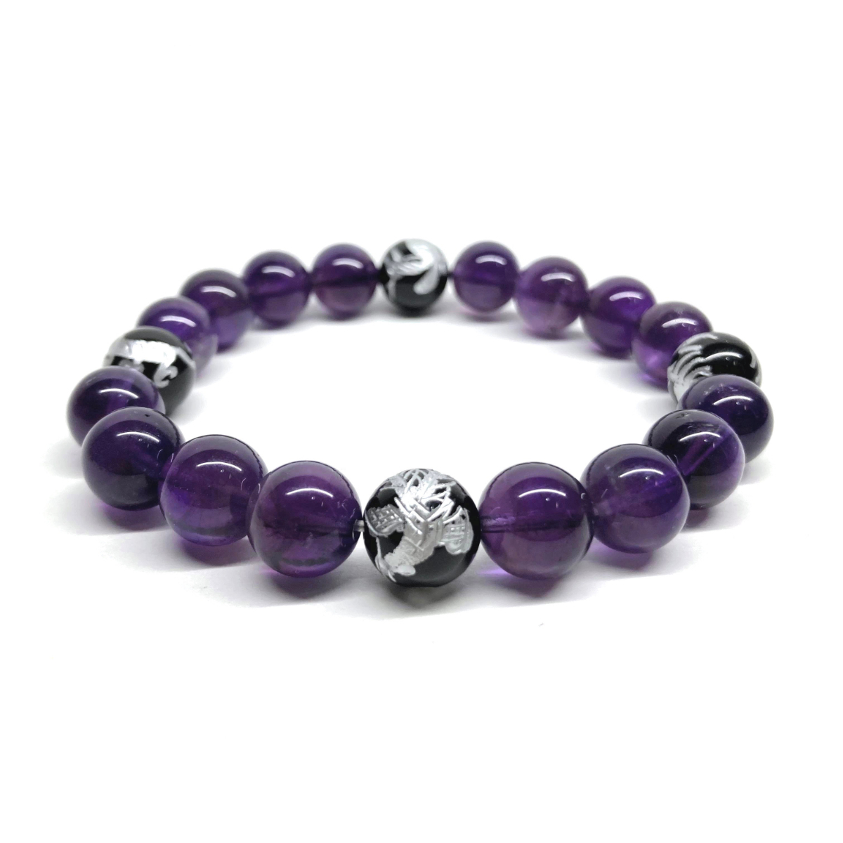 - 10mm 四神獣銀彫オニキス×アメジスト パワーストーン ブレスレット天然石 運気上昇 開運 金運 恋愛運 青龍 白虎 玄武 朱雀 ☆