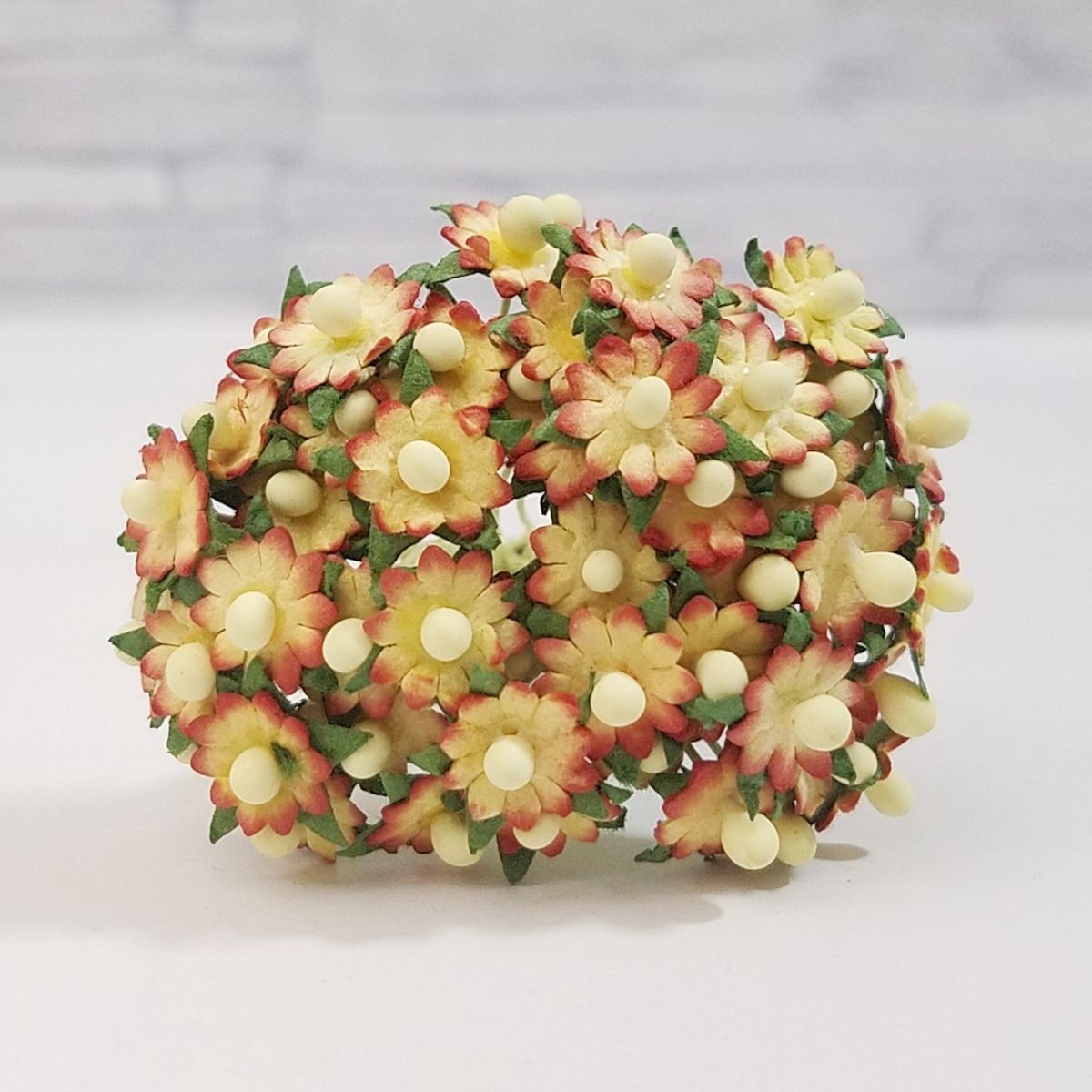 - 造花[ミニ・ペーパーフラワー マーガレット風(バイカラー/赤&黄色 #501) 直径約10mm 50本] 手作り ハンドメイド リース