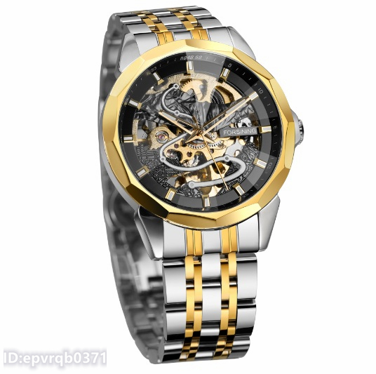 > 男性高級腕時計♪ 新品 機械式自動巻 3針 スケルトンデザイン シンプル メンズ ウォッチ 夜光表示 防水3ATM 紳士用 カジュアル 黒/ゴールド