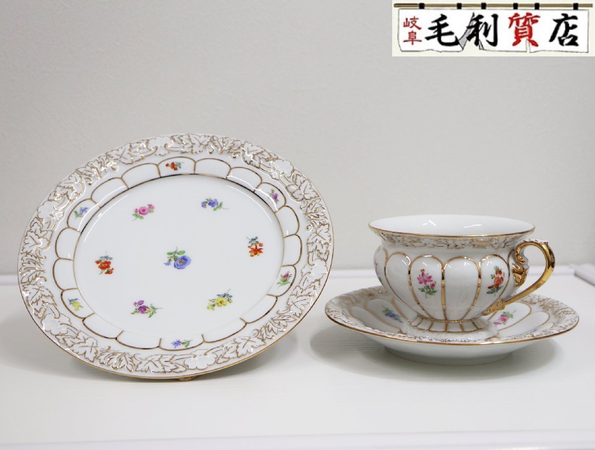 > マイセン MEISSEN カップ ソーサー プレート3点セット Xフォーム ゴールド ホワイト 花柄 洋食器 【中古】 陶器