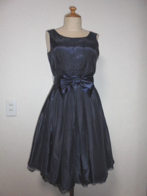 - ネイビー色上身胸元プリーツ加工胸下切替リボンモチーフベルト付タックプリーツOP