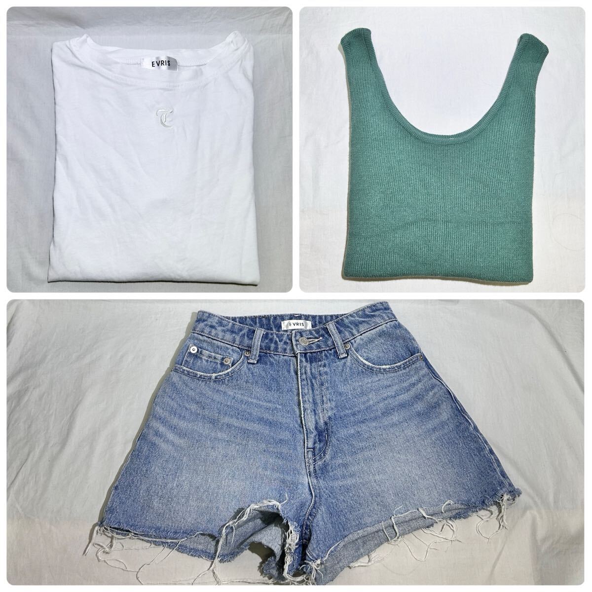 ★美品★3点セット★EVRIS トップス ノースリーブ ニット ホワイト 刺繍ロゴ Tシャツ ショートパンツ デニム レディース 春夏 (04047A