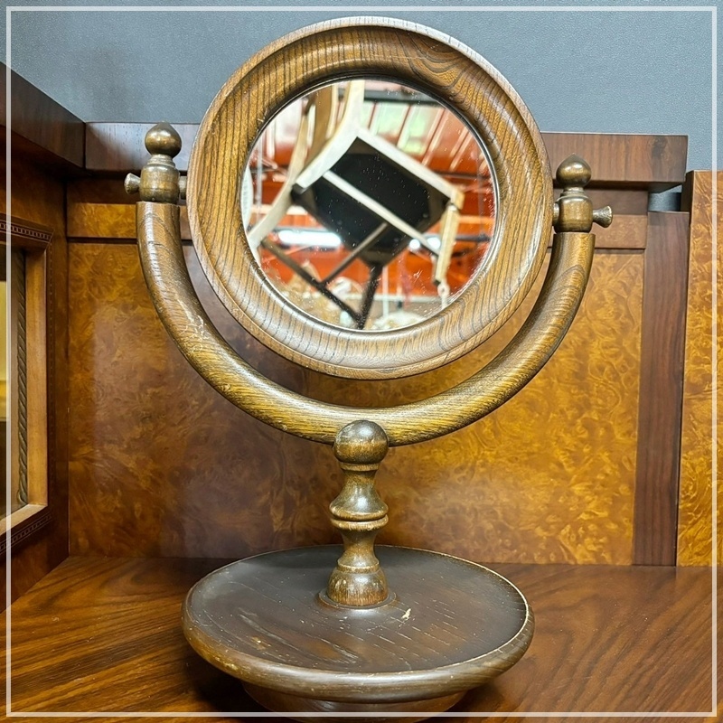 - 【福岡】ヴィンテージ 木製 卓上ミラー 丸 高さ33cm 回転式スタンドミラー 鏡台 ラウンド レトロ オシャレ 古道具 当時物【RU1118-6】