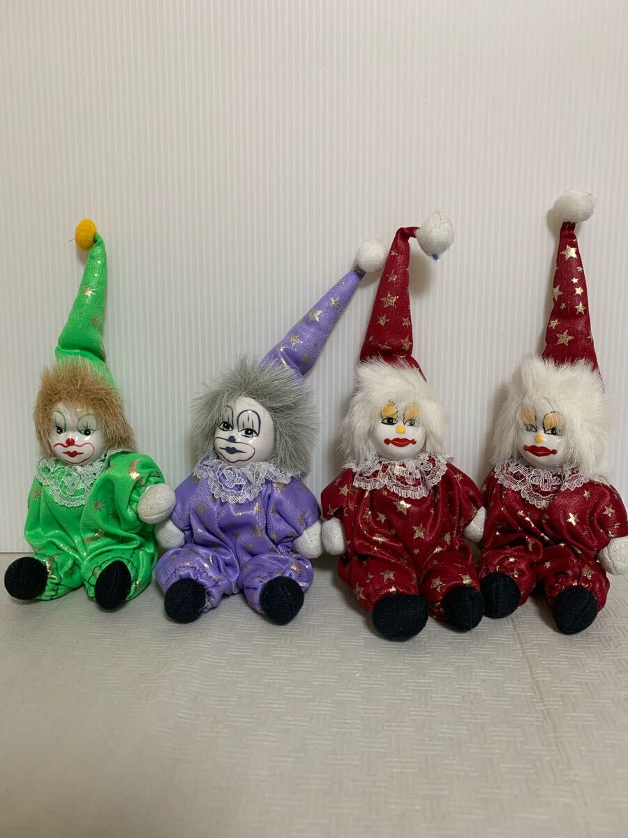 - ピエロ 人形 置物 4体セット/道化師/ドール/星柄服/インテリア小物/部品取り用/メーカー名不明/長期保管の経年