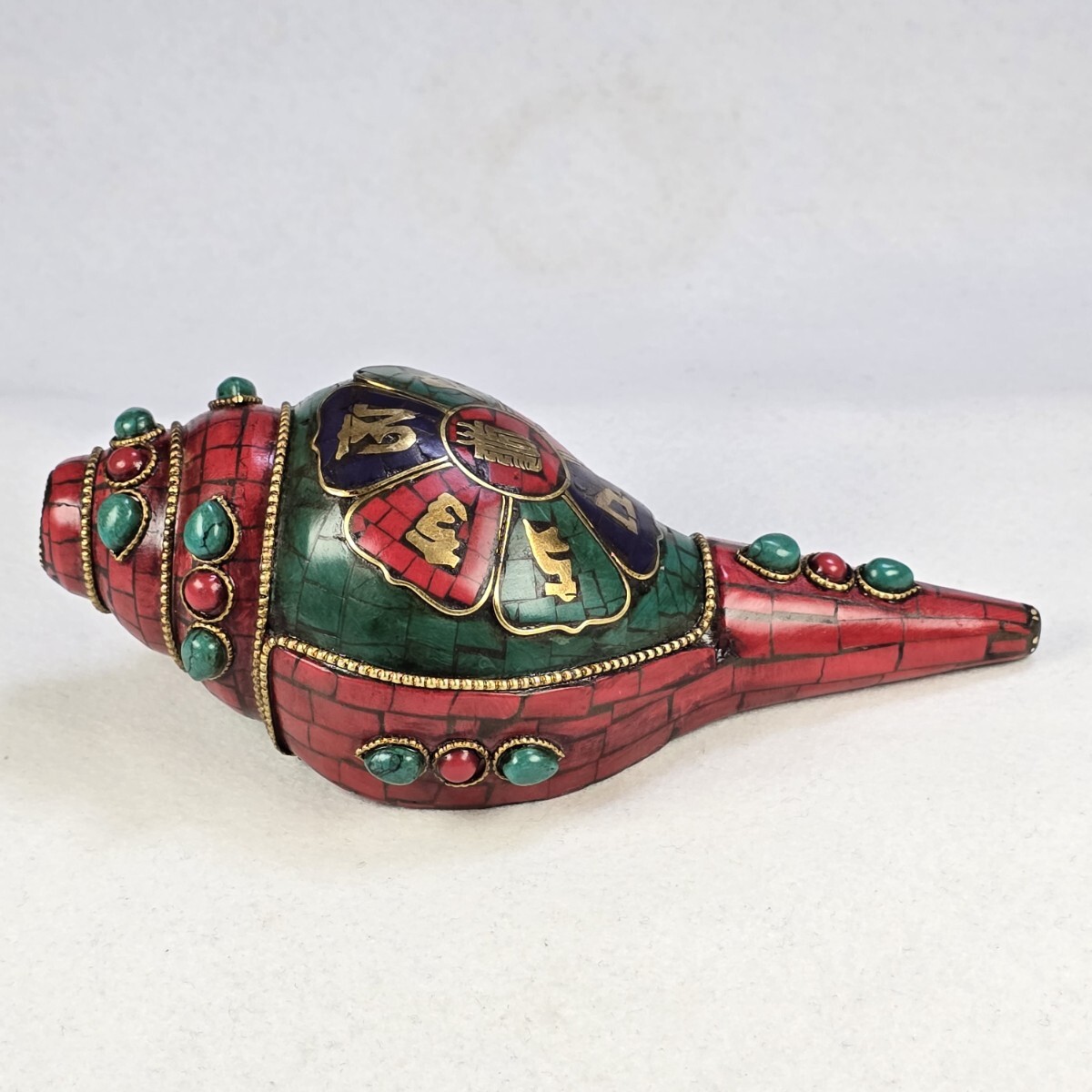 - 古仏具 法器 チベット細工七宝 六字大明呪紋 降魔法螺 金剛法螺 置物 美品