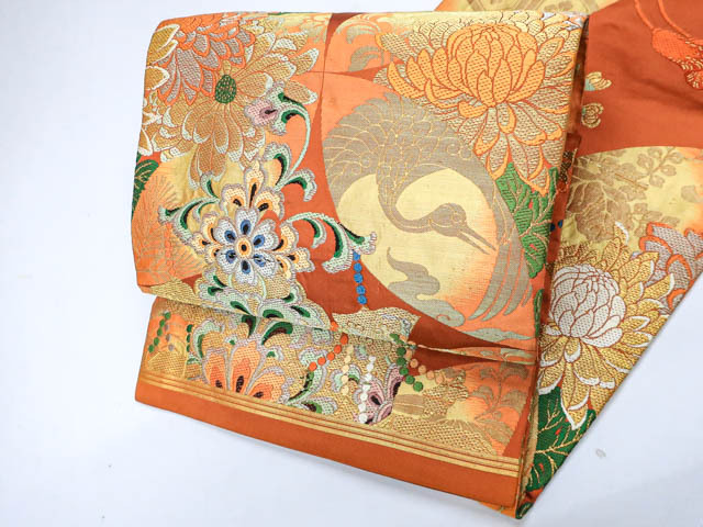 > 《古美術京松》【着物】アンティーク 丸帯 金糸 全通柄 丸に鶴・花尽くし文 r7b01-11a