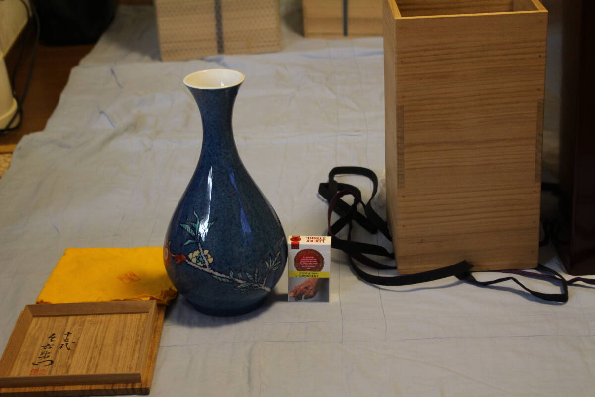 > 十三代今右衛門 青い 花瓶 椿か牡丹 銘は花瓶と箱の蓋に有り (十三代) 箱付き