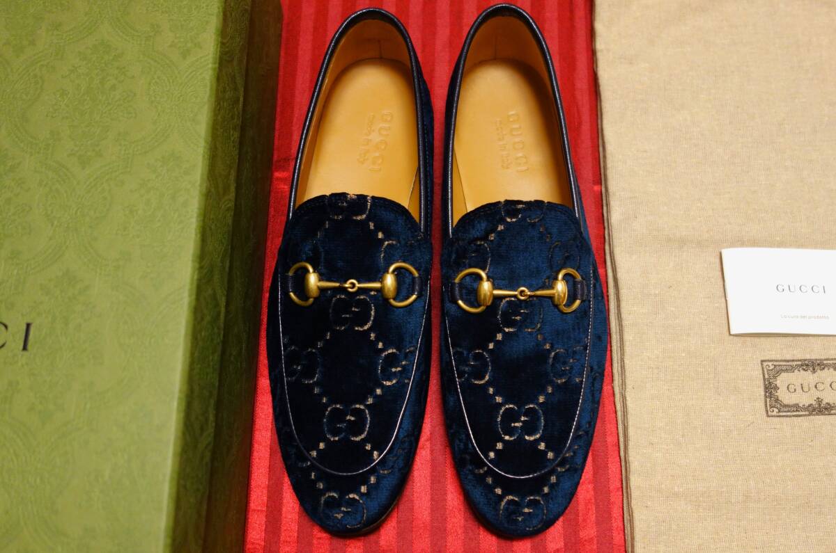 - 定価13万円↑ 未使用品 グッチ(gucci) GGファブリック×レザービットローファー 71/2(日本サイズ26~26.5cm) ネイビー