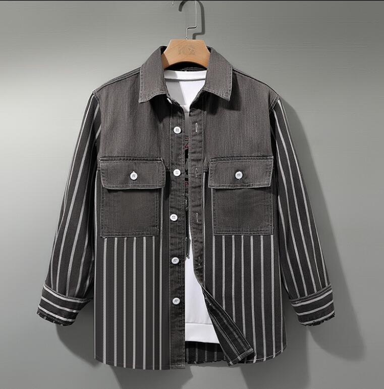 - 新作人気デニムジャケット メンズ ジージャン ストライプ 折り襟 シャツ 紳士 トップス ウォッシュ カジュアル グレーM~2XL