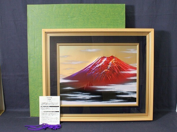 - 【未使用】 高岡銅器 銅板彫刻パネル 彫金「麗峰 赤富士」 秀玉作 金属工芸 D642