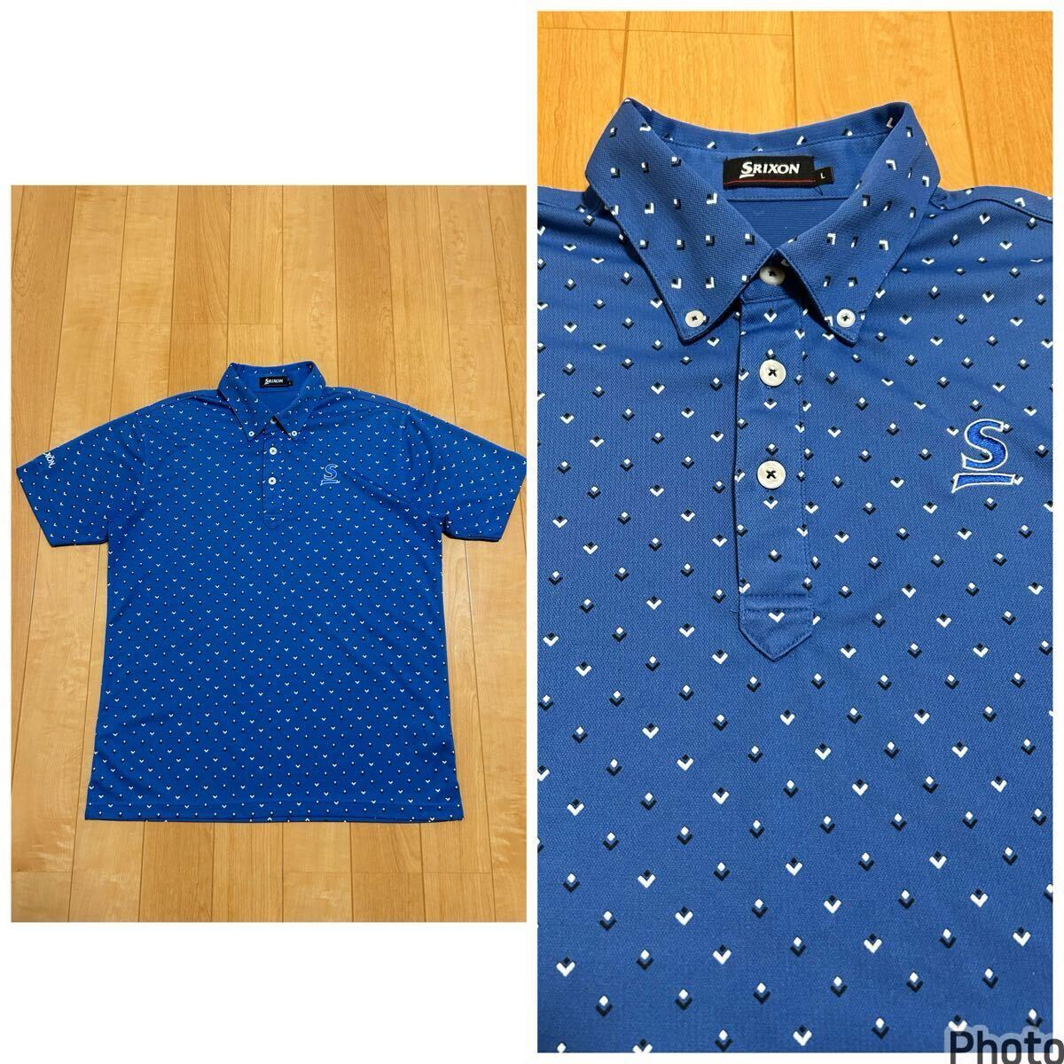 - 良品★SRIXON・スリクソン メンズサイズL 半袖BDポロシャツ.快適爽快速乾ドライ生地 全面ユーロ調総柄入/各ロゴマーク刺繍入! ネイビー