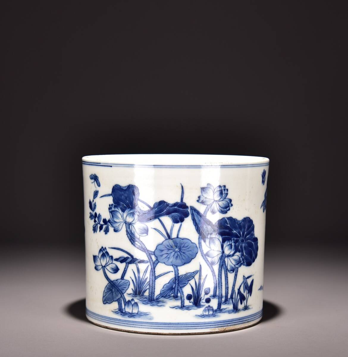 - ▽鴻▽ 清 康熙年製款 青花 荷趣紋 筆筒 古陶瓷品 置物 古賞物 中国古玩 中国古美術