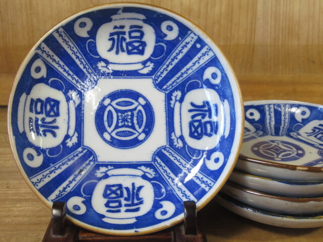 - ◆図変わり印判皿:2:◆『福』◆耳付香炉:花器:勾玉◆見込み:丸に外向四鐶変わり菱紋◆明治期◆取り皿◆小皿◆5客◆