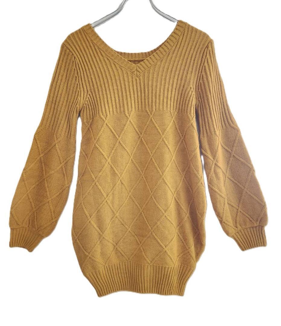 - 長袖ニット Vネック マスタードイエロー チュニック丈 LA 春