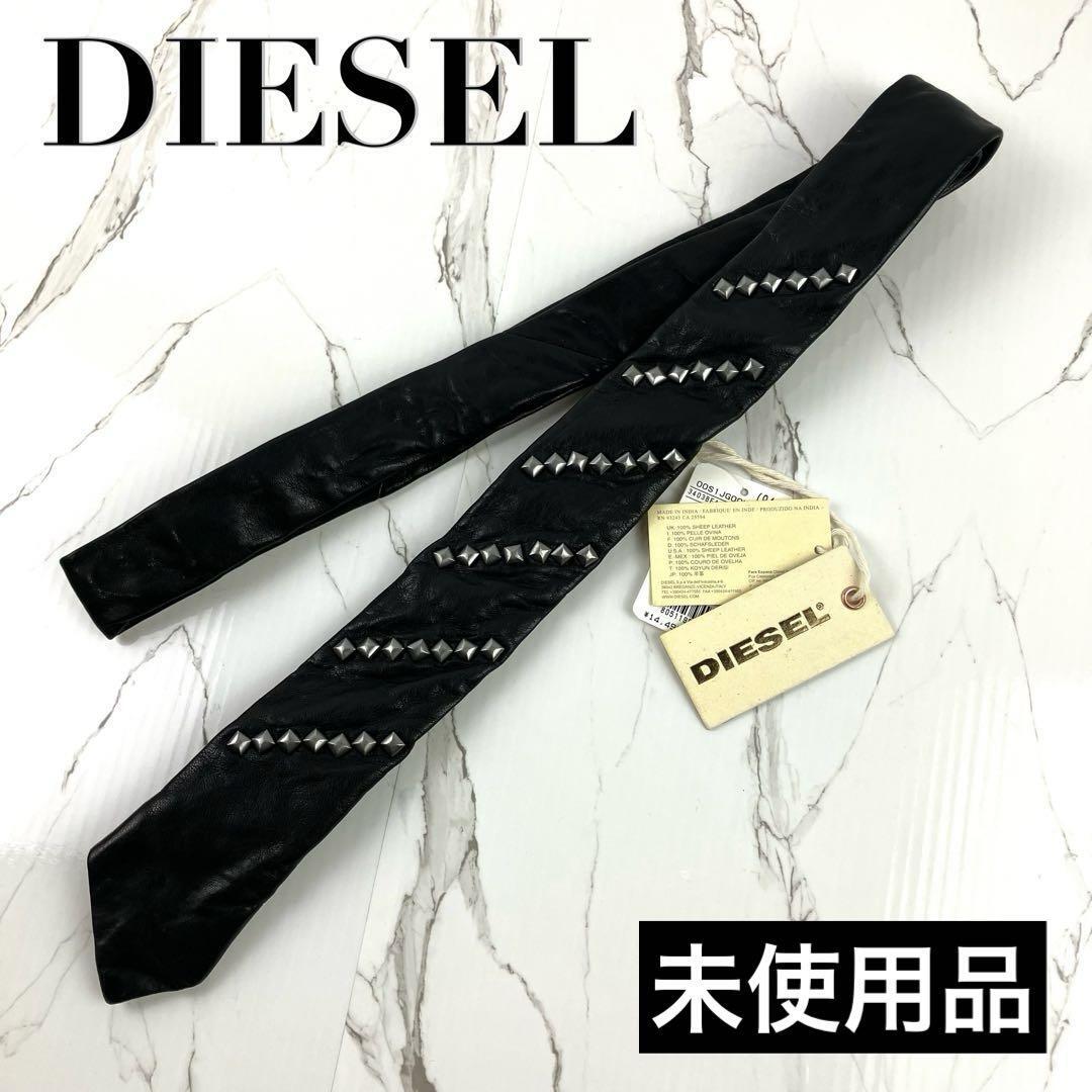 - 未使用品 DIESEL ディーゼル ネクタイ レザータイ ナロータイ ラムレザー スタッズ ストライプ ブラック