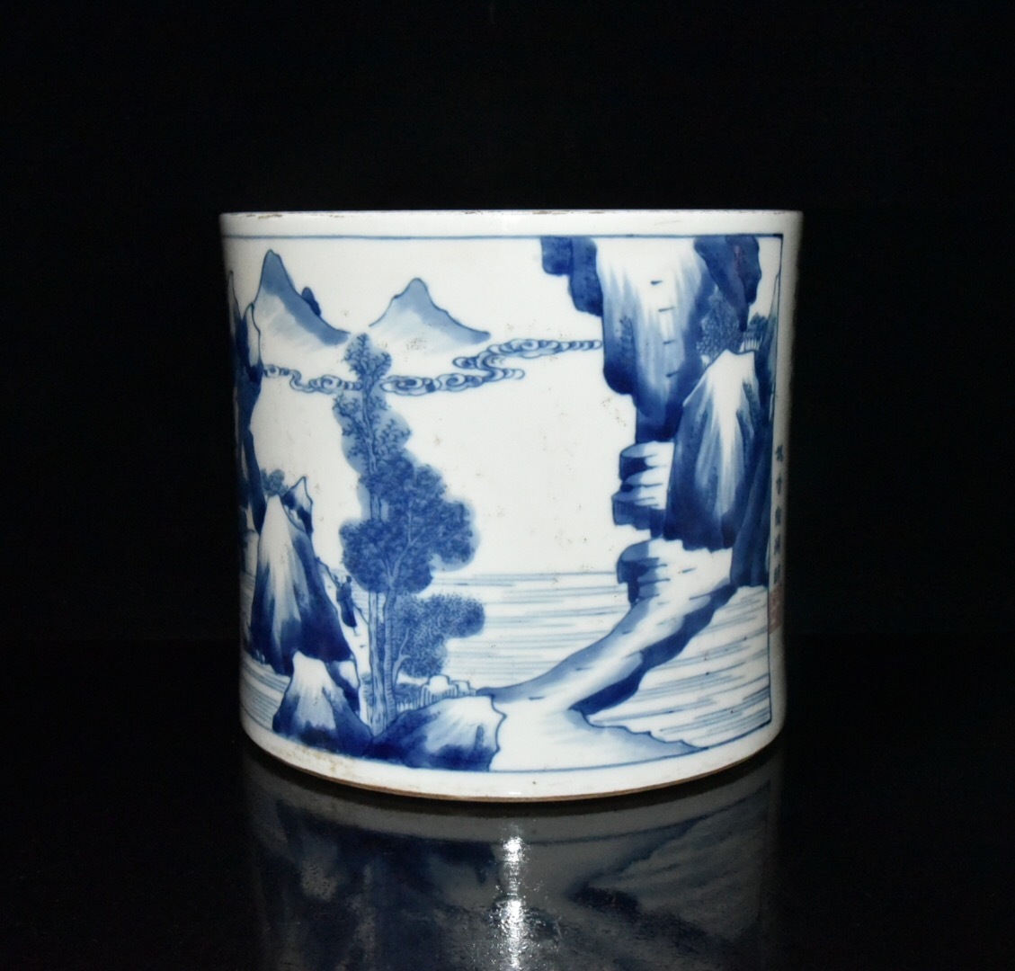 - 【超珍館蔵】清 康熙年製款 古陶瓷品 青花 桃花源記紋 筆筒 置物 古賞物 古美術品 稀少珍蔵品