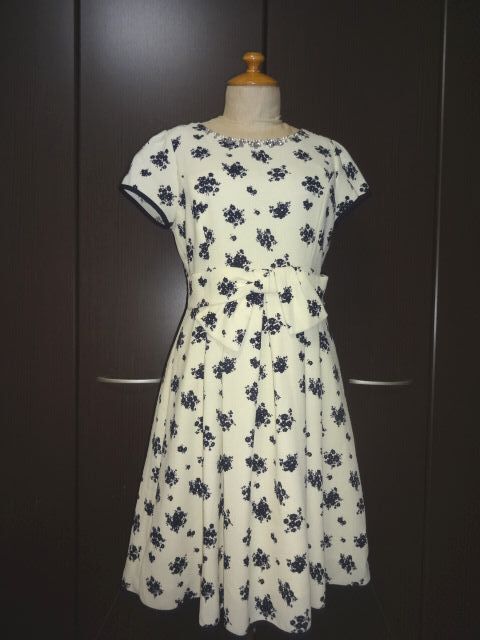 - クリーム色小花束柄衿ぐりジュエルビジュー付WリボンモチーフOP