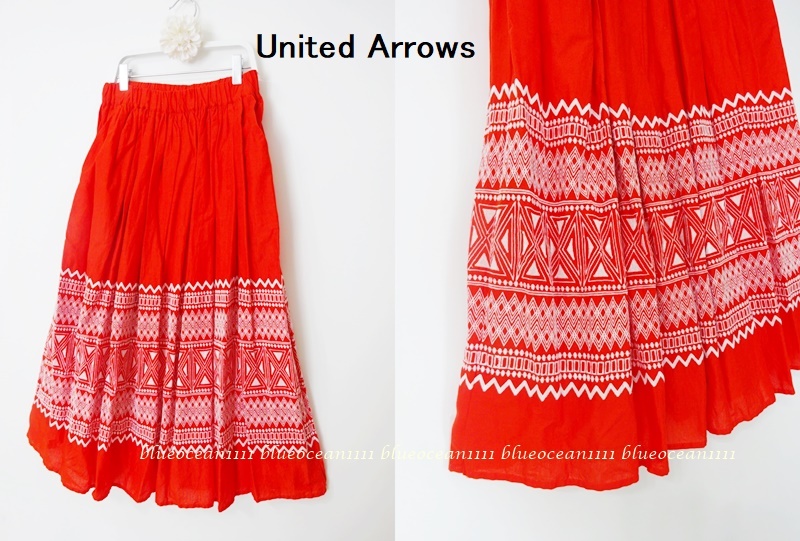 > 新品 22,000円【ユナイテッドアローズ】朱赤 豪華ボヘミアン刺繍 コットンギャザースカート36 (S-M) Tシャツ ブラウス ワンピ パンツ