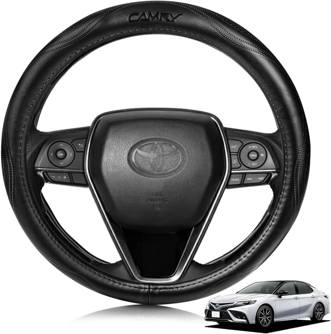 - トヨタ カムリ CAMRY ハンドルカバー 高級本革 ステアリングカバー 防水 滑り止め 3Dグリップ ロゴ オールシーズン対応 ブラック