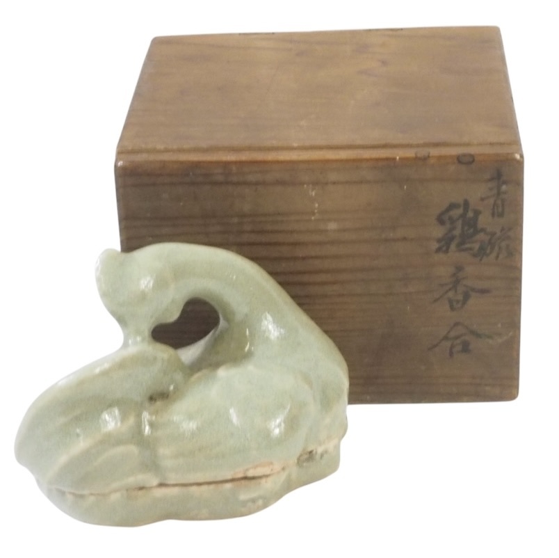 - 昭和初期ビンテージ 青磁 鶏香合 茶道具 香道具 木箱付 TMA704