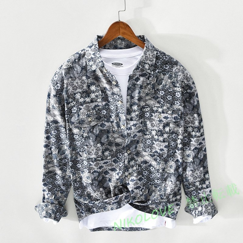 - 新品 シャツ メンズ 長袖シャツ 花柄シャツ 春夏 トップス コットン 柔らか スウェット 総柄 おしゃれ サイズ選択可 ブルー