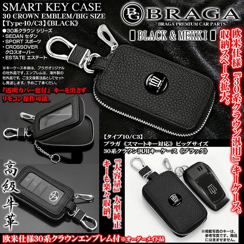 > 200/210/220クラウン キーケース/Lサイズ/ブラック/30系クラウンエンブレム付/タイプ10/C3/窓/回転フック/スマートキー/牛革/ブラガ