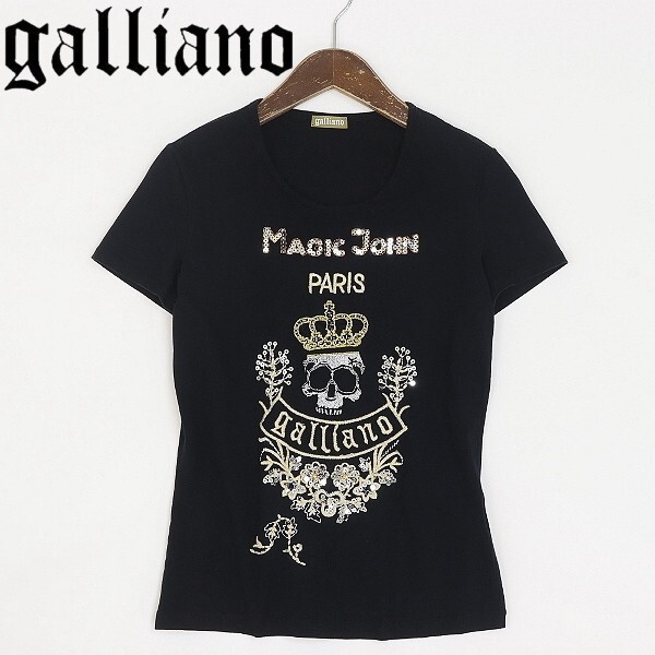- ◆John Galliano ジョンガリアーノ ストレッチ ビーズ&スパンコール装飾 ロゴ スカル刺繍 コットン 半袖 Tシャツ 黒 ブラック M