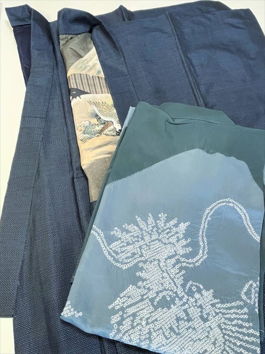 - 花とら●リサイクル着物 男物 アンサンブル 紺系 長襦袢付き リメイク 素材 250405