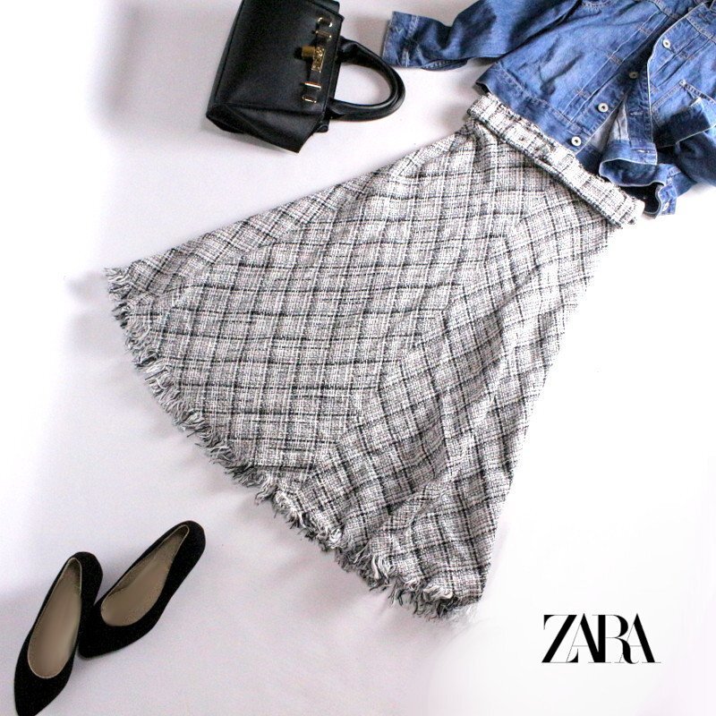 > 美品 春 夏 ZARA ザラ ミモレ丈 ベルト付き 定番 コットン フリンジ チェック柄 ツイードスカート フレアスカート XS 白 ブラック 黒