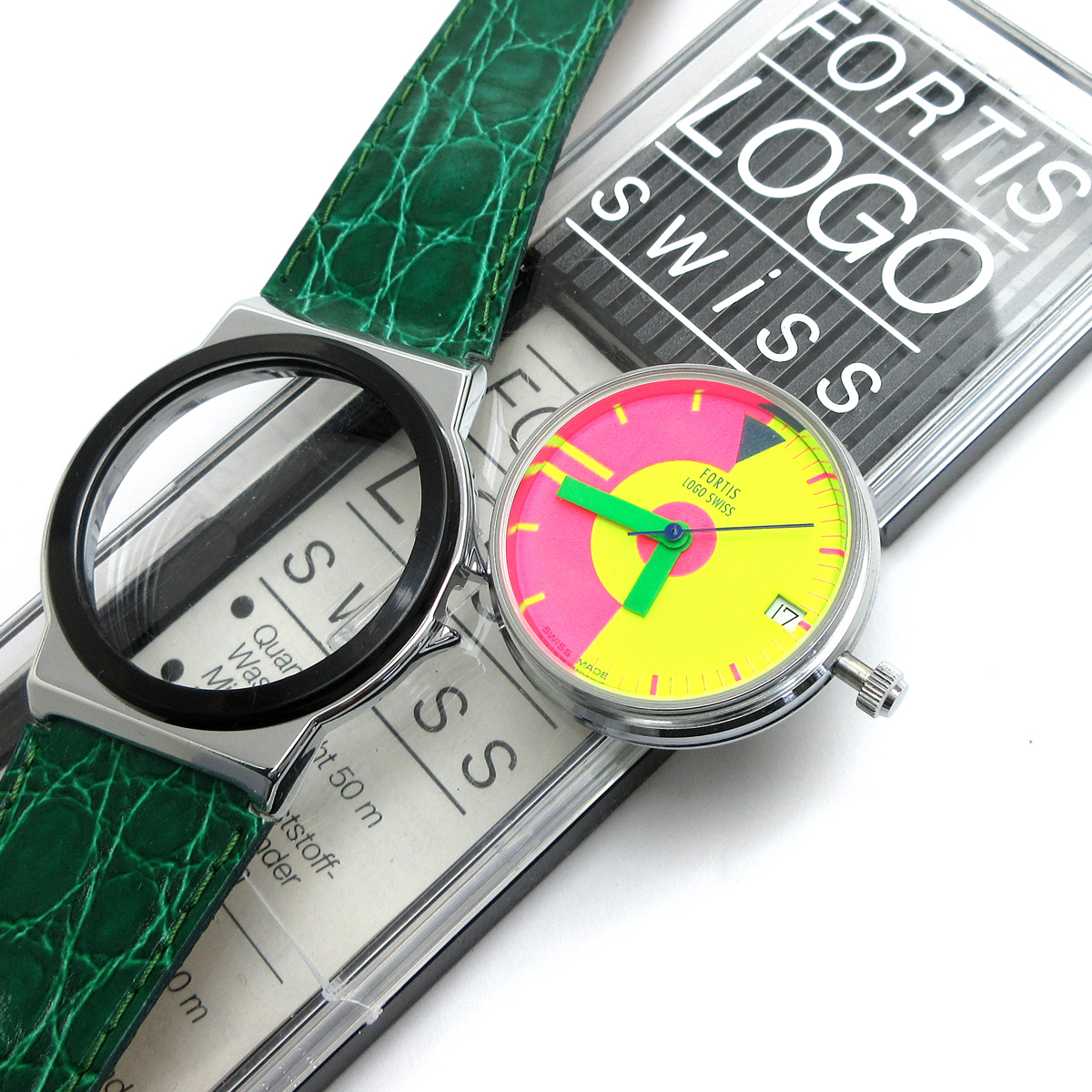 - フォルティス 時計 ロゴ ポップ ボーイズ デイト 緑 革 黄 ピンク文字盤 560.20.132 FORTIS LOGO 婦人 メンズ 箱 保証書 クォーツ