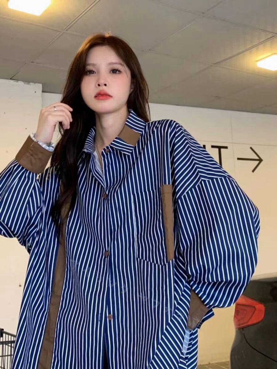 - シャツ ブラウス レディース ストライプシャツ春秋上着羽織前開き長袖襟付き オーバーサイズボタン薄手 かわいい(M-3XL)サイズ選択可
