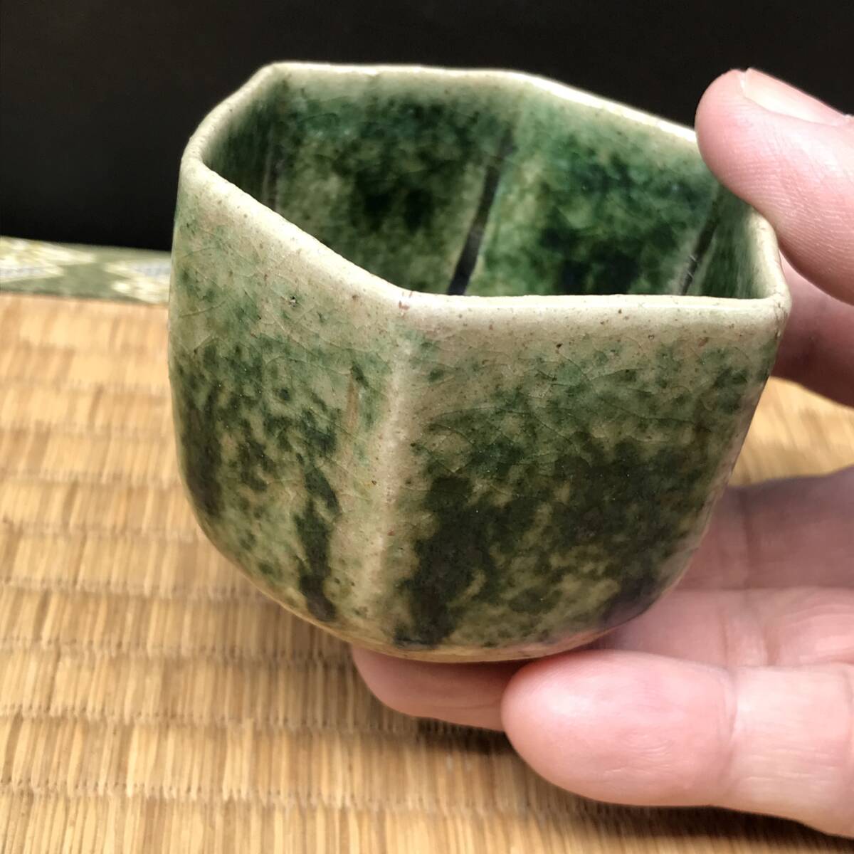 - 青織部六角のぐい呑み 酒器 猪口 小鉢 ぐい飲み 盃 杯 珍味入れ(R70416_C)