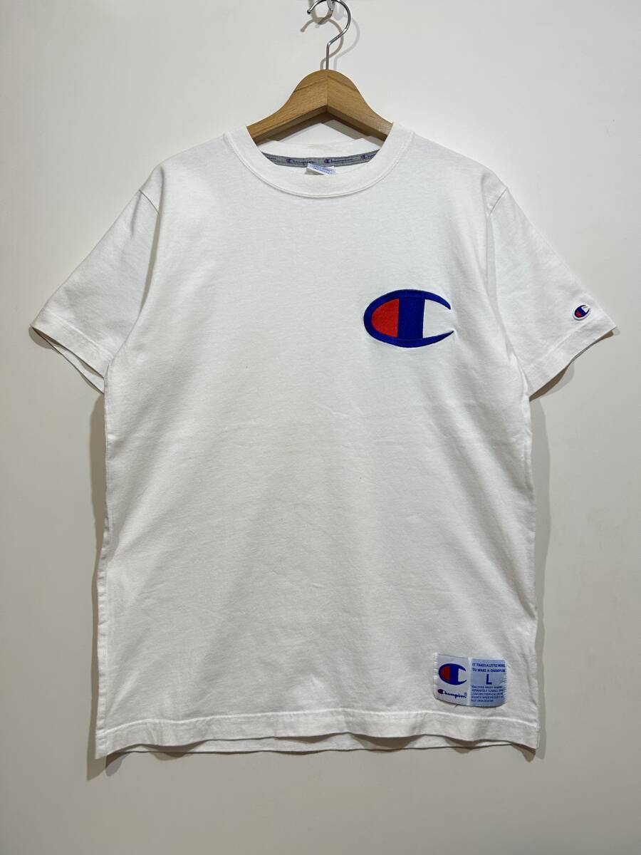 > ● Champion Cマーク 刺繍 デカロゴ 半袖 Tシャツ 白 ホワイト L ユニセックス 天竺生地 コットン ストリート ACTION STYLE