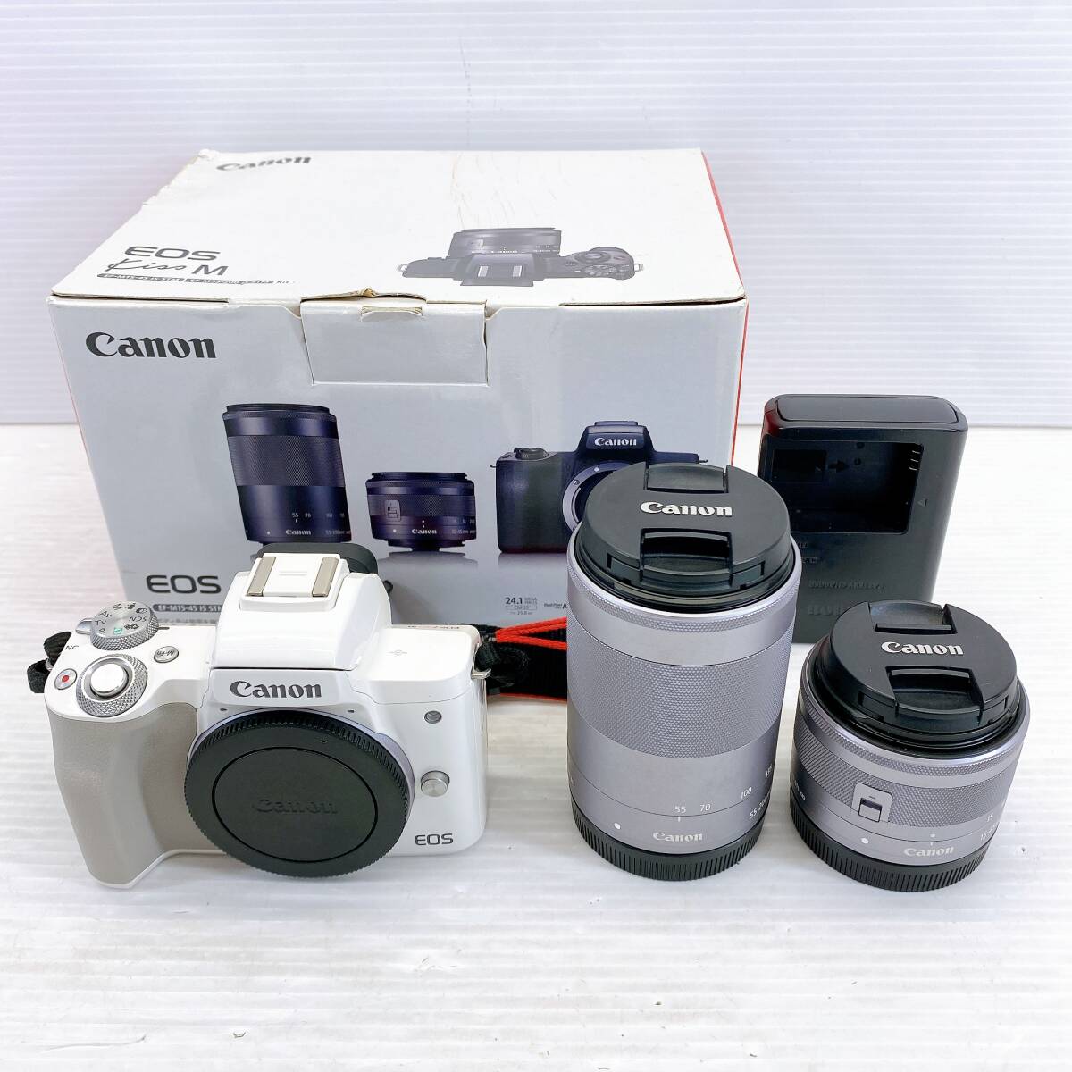 > ■Canon EOS Kiss M ミラーレス一眼レフカメラ ホワイト ダブルレンズキット [EF-M15-45/M55-200] 良品■