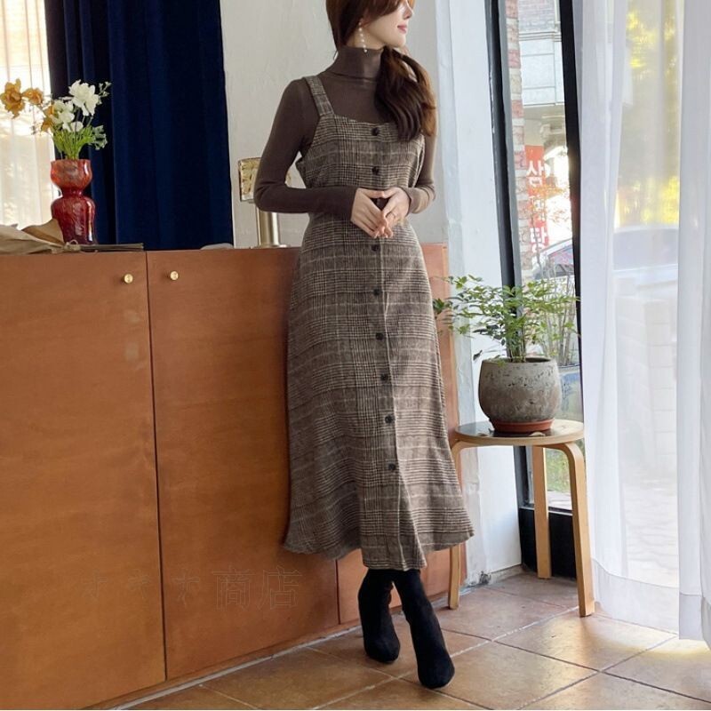 - チェック柄 ワンピース レディース サロペットワンピース 秋冬 ロングワンピース ロング丈 チェック ジャンパースカート 重ね着