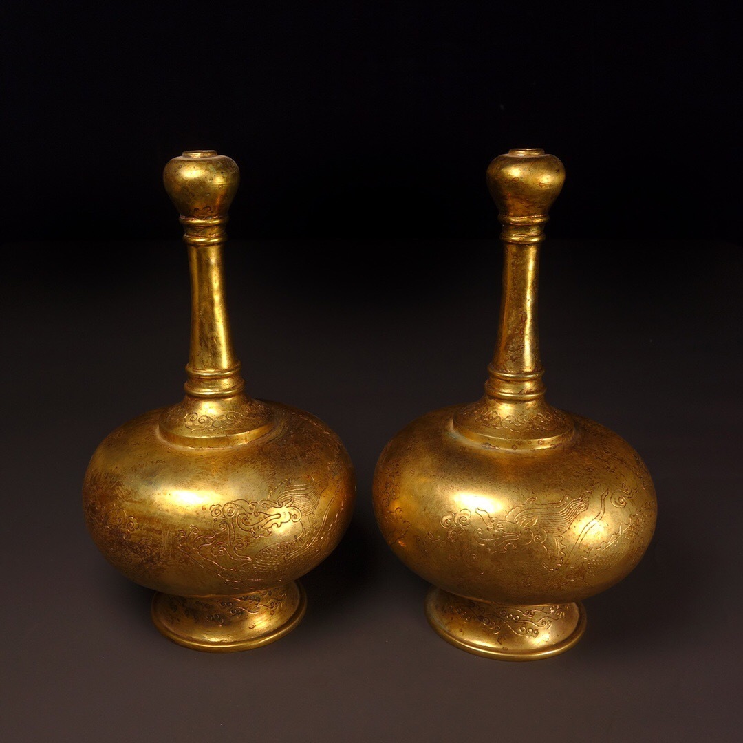 - 【超珍館蔵】銅製 塗金 神獣紋 蒜頭瓶一對 置物 賞物 古賞物 古美術品 稀少珍蔵品
