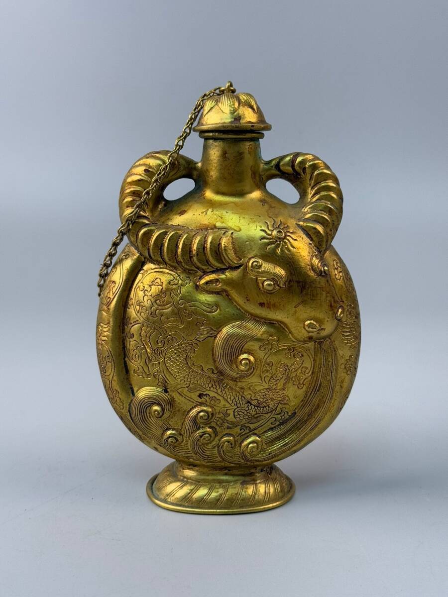 - 【超珍館蔵】銅製 塗金 羊頭酒壺 置物 賞物 古賞物 古美術品 稀少珍蔵品