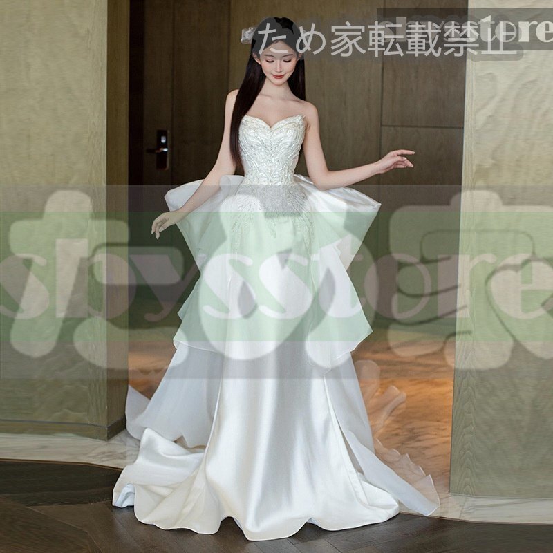 - 大値下げ フィッシュテール フランス風 ウェディングドレス 新婦 ビストップ サテン シンプル 高級 婚約ドレス トレイン