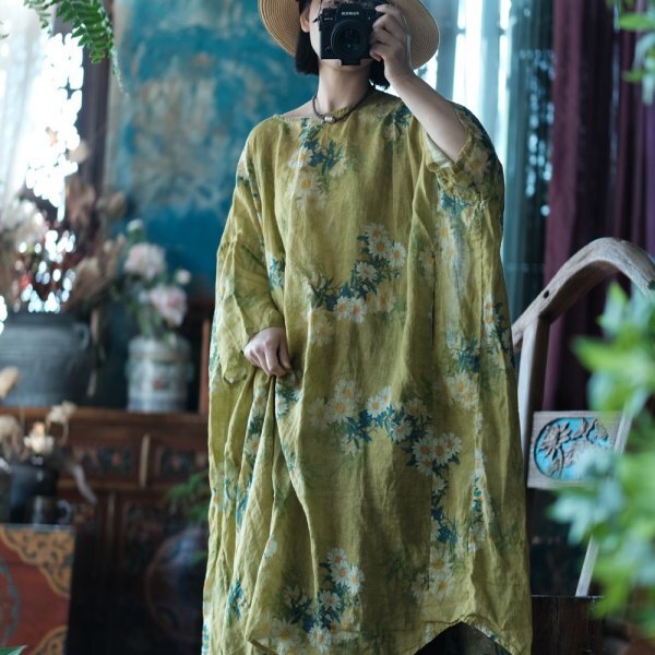 - lgn 2407 2180 ワンピース チュニック アンティーク風 洋服ミックス ロマンファッション 苧麻100% 紫外線日焼け防止 花柄 イエロー