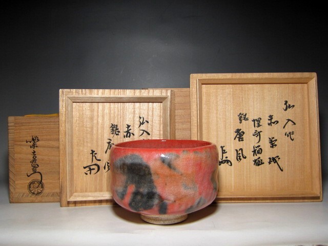 - 楽十二代 弘入 赤茶碗 「唐風」 共箱 表千家十二代 惺斎・即中斎花押 二重箱 e658