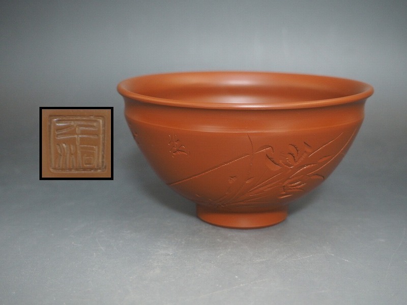 - A3970 常滑焼 渡辺千洞 作 花彫文 朱泥茶碗 ☆ 茶道具 抹茶器 茶器 抹茶道具 茶懐石 茶事 茶の湯 茶碗 抹茶碗 陶器 作家物 在銘 陶印 良品