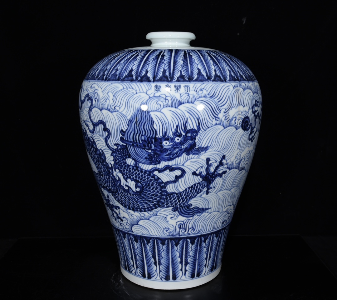 - ◆旧家蔵出◆古美術 中国古玩 大明宣徳年製款 青花 海水龍紋梅瓶 細密細工造 置物 擺件 古賞物 骨董 時代物 AT08