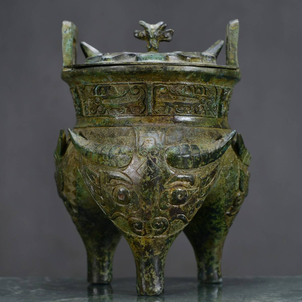 - ◆旧家蔵出◆古美術 中国古玩 商周 古銅製 青銅器 銘文 獸面三足盖鼎 細密細工造 置物 擺件 古賞物 時代物 AT17