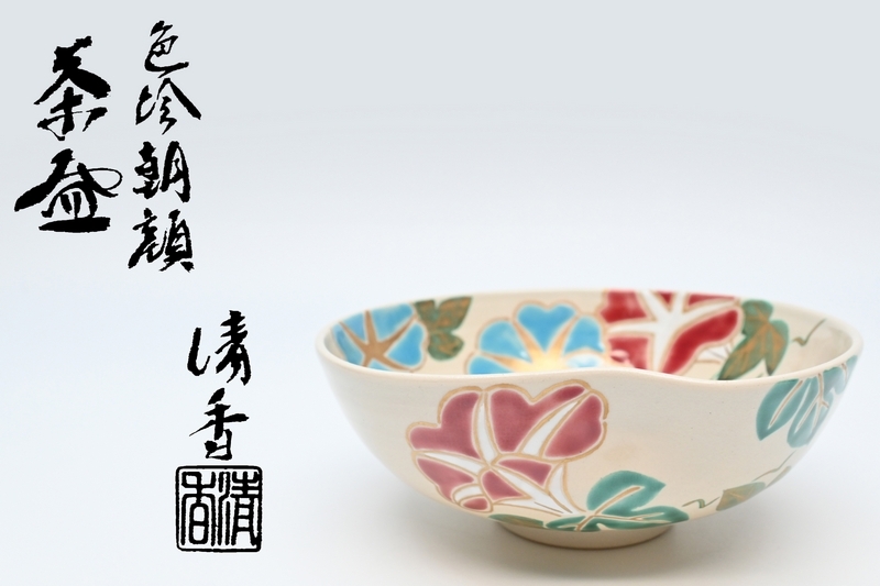 > 清香 京焼 茶碗 ■ 色絵朝顔 [ 茶碗 ] 裏印 ■ 未使用 美品 茶道具 栞 共布 共箱 ■