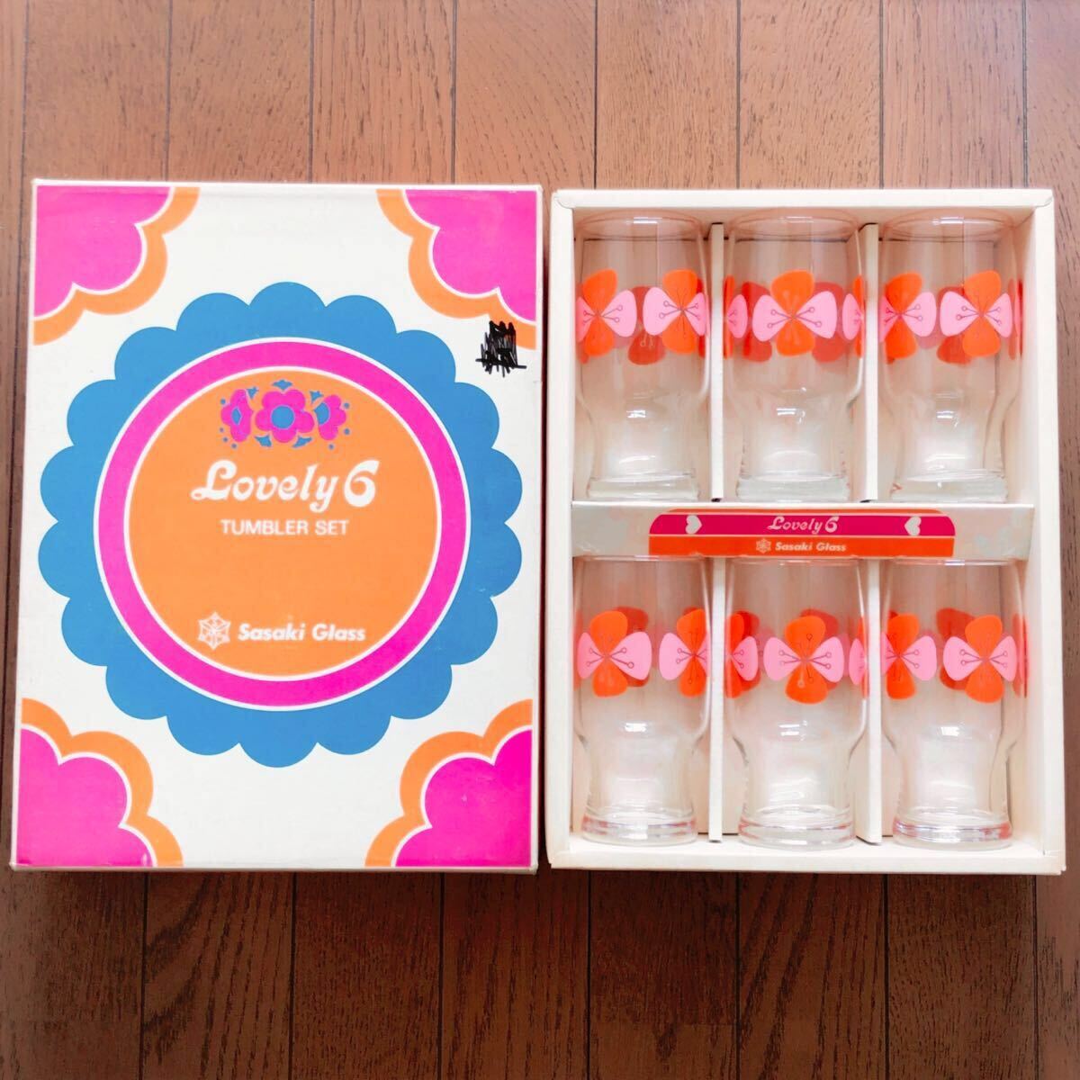 - 佐々木硝子 lovely6 グラス ガラス タンブラー ピンク 赤 花柄 箱入 未使用 昭和レトロ アデリアレトロ レア レトロポップ